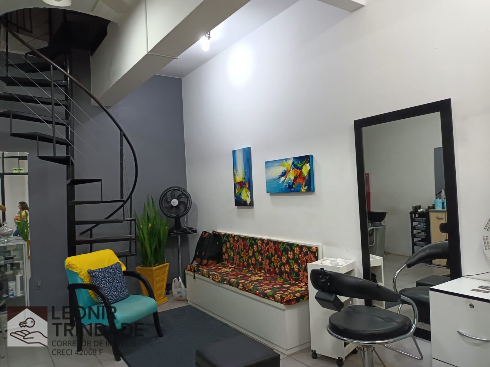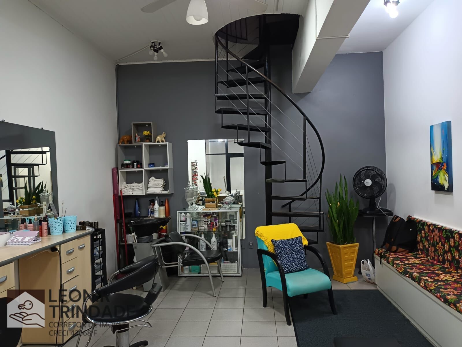 A LOJA TEM 47, 75 m² DE ÁREA PRIVATIVA, COM MEZANINO, BANHEIRO SOCIAL, ESPERA PARA INSTALAÇÃO DA COZINHA, A ESCADA CARACOL E A PORTA DE ENTRADA É DE FERRO.
